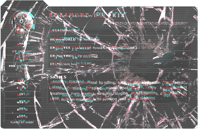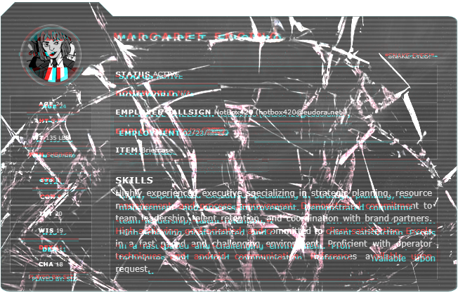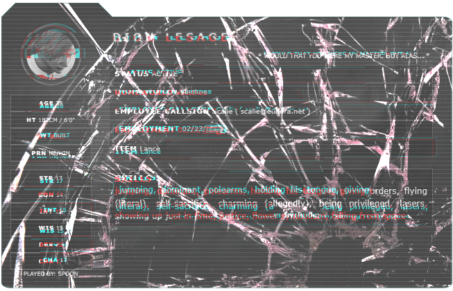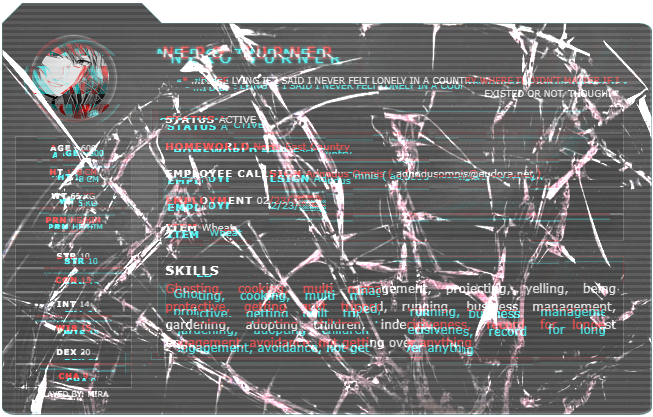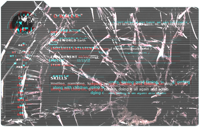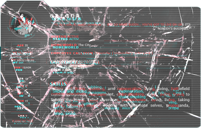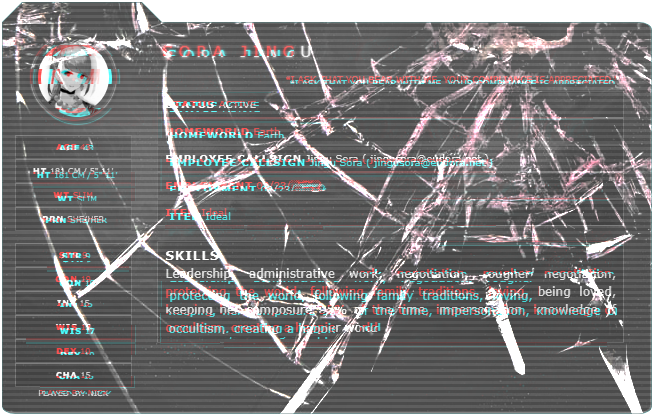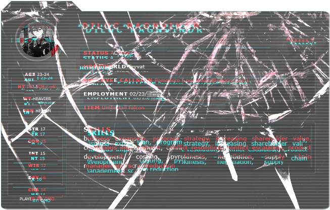 Please fill out the following for your character's IC profile. The information in your profile can be funny, vague, shitposty, but it should be accurate to the character in some way. All information that requires your input is within **stars**.