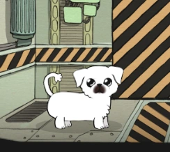 She slightly opens a metal door and they will find this. Ppodae is a small, white pug puppy with "puppy dog eyes" and a curved in tail. ]